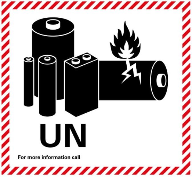 Štítok je v súlade s predpismi IATA pre nebezpečný tovar. Okraj značky musí mať červené šikmé šrafovanie. Symbol (skupina batérií, jedna poškodená a vyžarujúca plameň, nad UN číslom pre lítium-iónové alebo lítium-kovové batérie alebo články) musí byť čierna na bielom alebo vhodnom kontrastnom pozadí. Značka lítiovej batérie môže byť vytlačená priamo na vonkajšom obale za predpokladu, že je dostatočný kontrast medzi prvkami značky lítiovej batérie a farbou obalového materiálu.